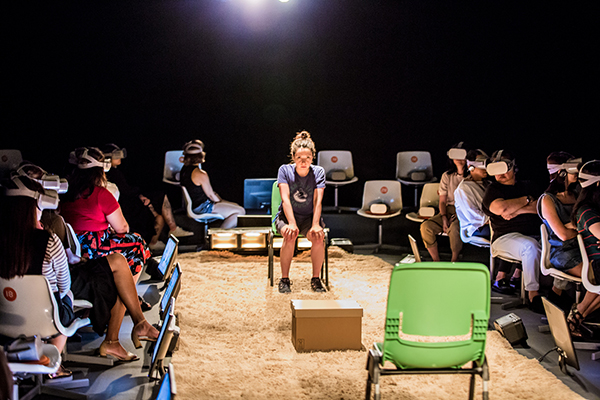 Having securely fastened the headgear, I am submerged into the virtual world of Frogman. The instructional voice of the Queensland Jury service informs me through an earpiece that I have been selected at random to join a jury. I am accompanied by 49 others seated on swivel chairs arranged in two tiered rows surrounding the narrow, carpeted stage in SOTA Studio Theatre. The Queensland Judicial service logo is displayed on the monitor in front of my seat – the same logo that is currently projected within the Oculus Rift virtual reality headset as we synchronise our interface with the amphibious realities of Frogman’s live theatre and VR experience. This headset will present me with evidence – told through the form of reconstructed vignettes – for the trial of police diver Douglas Clark, a key suspect in the murder of a girl named Ashleigh Richardson. A red light now flashes, signalling me to remove the headset.
