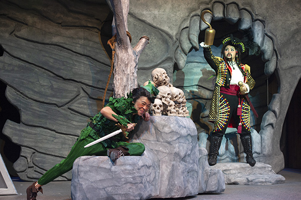 Peter Pan in Serangoon Gardens is the first panto to be staged in the company’s new space, the 358-seat Ngee Ann Kongsi Theatre, and part of the joy of the entire experience is its omnivorous, three-dimensional staging. Indeed, it is perhaps with this production that one is able to truly appreciate the full dramatic potential of this new venue.