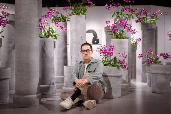 Entitled ‘Pollution’, the show runs until October 4, 2020, and features eight paintings and one video piece by Gongkan, alongside a series of florals self-portraits by photographer Naraphat Sakarthornsap. In addition to these individual works, the pair collaborated on an installation centrepiece that incorporates vibrant purple orchids, as both artists have an affinity towards using flowering plants to illustrate certain themes in their artwork. So, why the decision to work together?