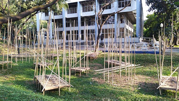 He had been working on a large bamboo installation on the front lawn of Vargas Museum at the University of the Philippines (UP) Diliman campus, on the subject of the current COVID-19 crisis. The work, titled “Kwarantin,” was to have opened on March 14, but due to the “community quarantine” that was declared just the day before, the opening was canceled.